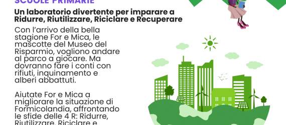 Un laboratorio divertente per imparare a Ridurre, Riutilizzare, Riciclare e Recuperare! In occasione del Festival della Sostenibilità, e per tutto il mese di maggio, il Museo del Risparmio offre alle classi delle scuole primarie un laboratorio didattico per introdurre ai bambini, con linguaggio semplice e divertente, i concetti base dell’economia ...