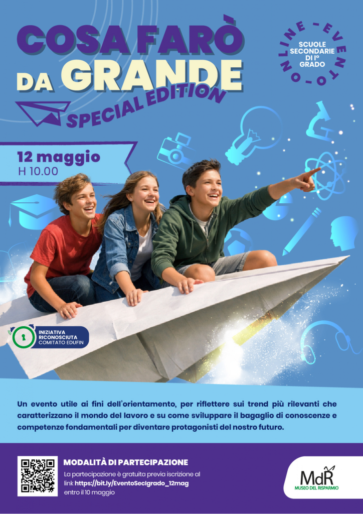 Dopo il grande successo registrato nell’edizione di novembre, il Museo del Risparmio torna il 12 maggio alle ore 10 con il webinar “Cosa farò da grande_Special Edition”, rivolto alle scuole secondarie di primo grado.