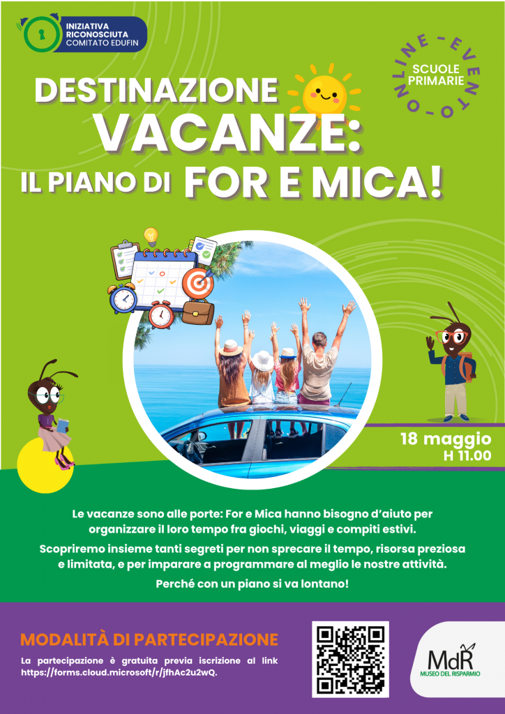 Il ciclo “Le avventure di For e Mica” si conclude con l’ultimo appuntamento in programma lunedì 18 maggio, alle ore 11,Destinazione vacanze: il piano di For e Mica”. L’incontro, organizzato dal Museo del Risparmio, sarà dedicato a come organizzare le proprie attività e gestire il tempo in modo efficace.