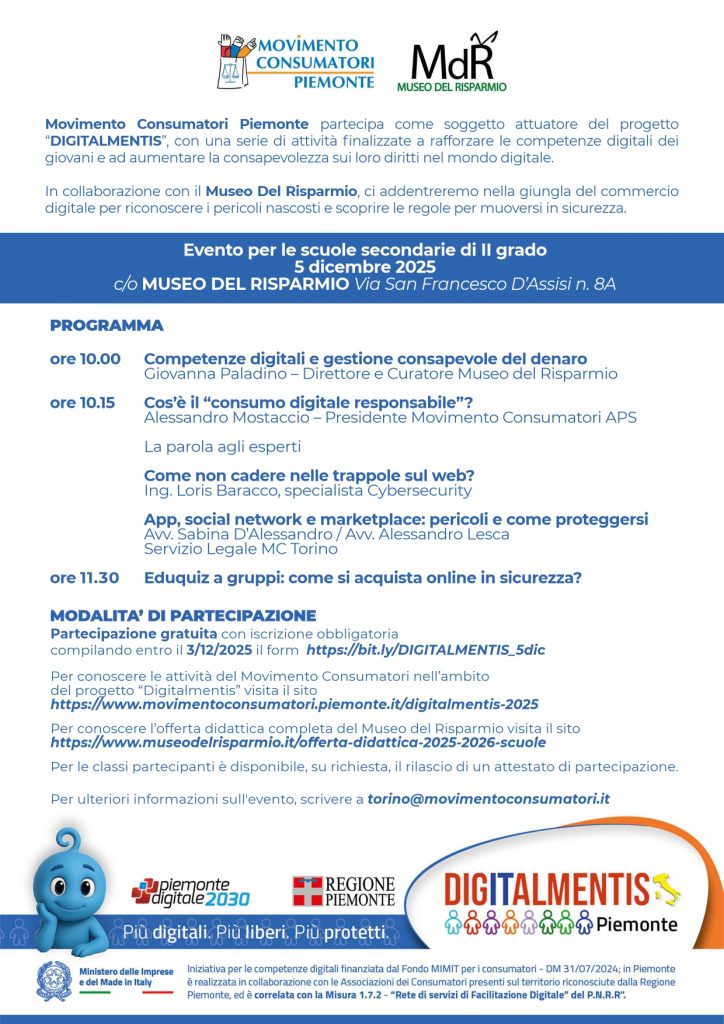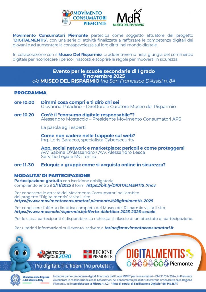 In collaborazione con il Museo Del Risparmio, Movimento Consumatori Piemonte partecipa come soggetto attuatore del progetto “DIGITALMENTIS”, con una serie di attività finalizzate a rafforzare le competenze digitali dei giovani e ad aumentare la consapevolezza sui loro diritti nel mondo digitale.