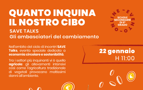 Giovedì 22 gennaio alle ore 11, il Museo del Risparmio organizza l’evento online “Quanto inquina il nostro cibo”, un appuntamento speciale del ciclo SAVE TALKS – Gli ambasciatori del cambiamento, dedicato alle scuole secondarie di II grado