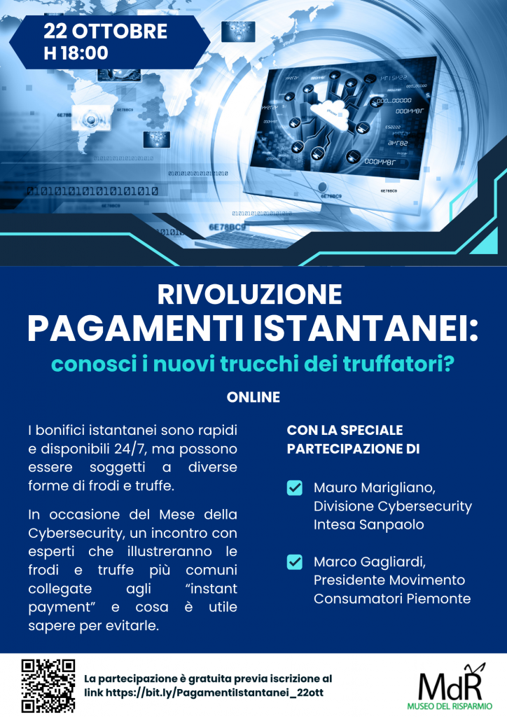 On Wednesday 22 October at 6:00 p.m., the Museum of Saving presents the online event “Instant payments revolution: do you know the new tricks used by scammers?”, an opportunity to learn about the most common frauds and scams related to instant payments and useful tips on how to protect yourself.