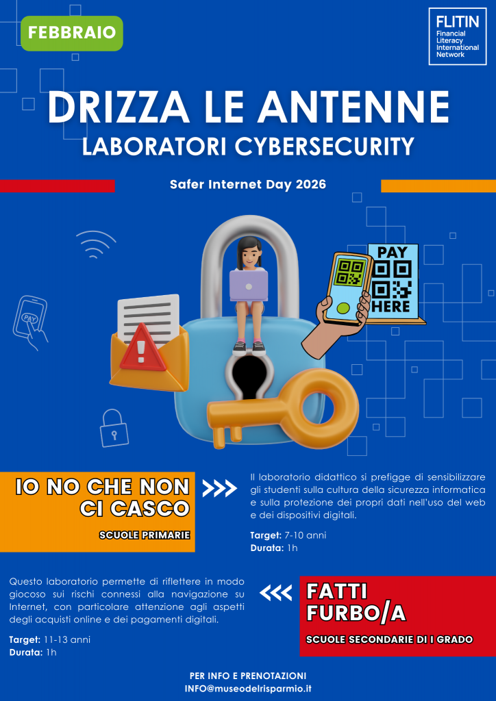 In occasione del Safer Internet Day 2026, per l’intero mese di febbraio il Museo del Risparmio e FLITIN – Financial Literacy International Network, la rete di ambasciatori del Gruppo Intesa Sanpaolo, propongono laboratori didattici online per sensibilizzare gli studenti delle scuole primarie e secondarie di I grado sui temi della protezione dai rischi digitali e della sicurezza dei pagamenti digitali.