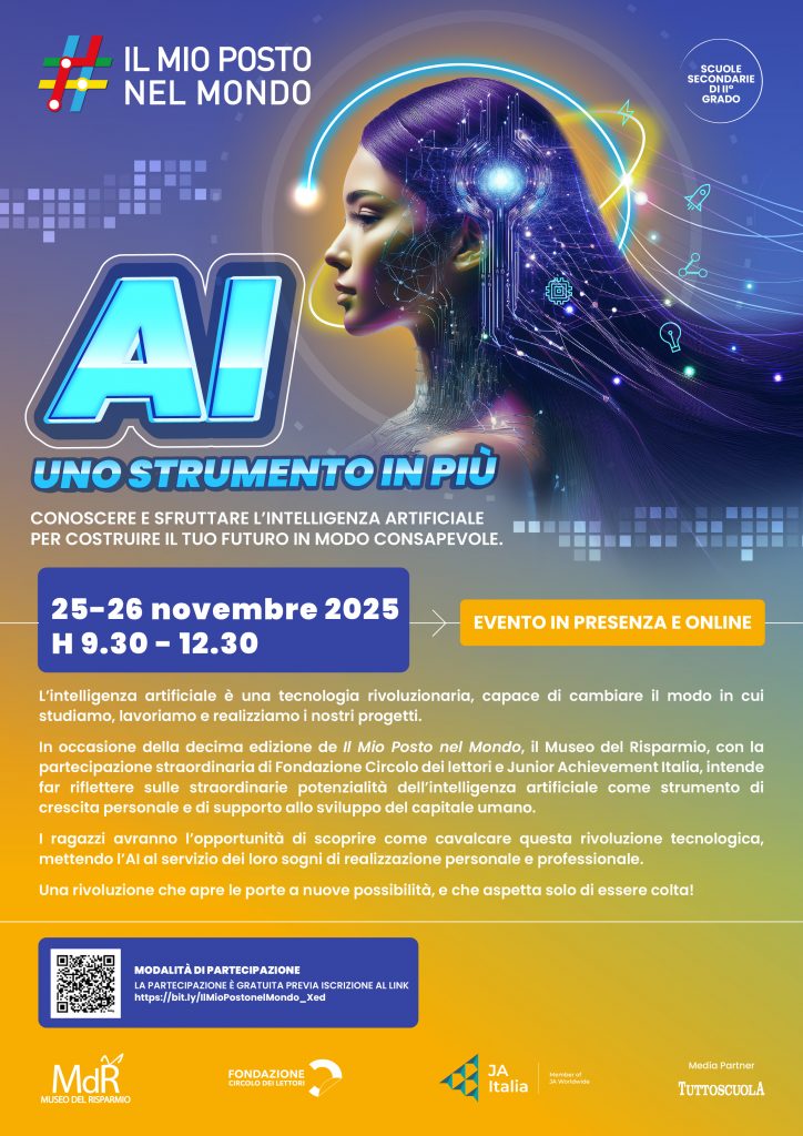 On the occasion of the tenth edition of My Place in the World, and within the framework of the Financial Education Month, the Museum of Saving, with the special collaboration of the Fondazione Circolo dei lettori, Junior Achievement Italia and the media partner Tuttoscuola, intends to encourage reflection on the extraordinary potential of artificial intelligence as a tool for personal growth and support for the development of human capital.