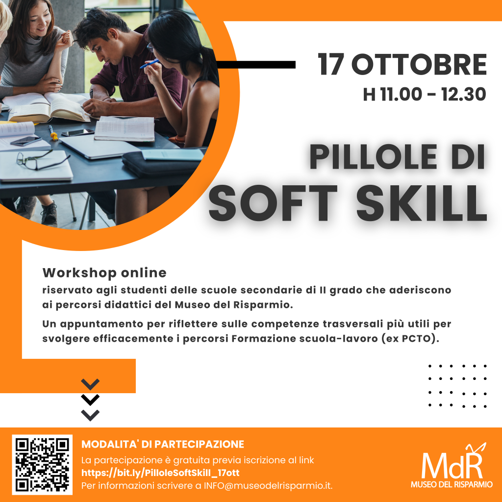 Venerdì 17 ottobre alle ore 11 il Museo del Risparmio è lieto di invitare le scuole aderenti ai nostri “Percorsi di Formazione Scuola-Lavoro” (ex PCTO) a partecipare al workshop online “Pillole di Soft Skill“.