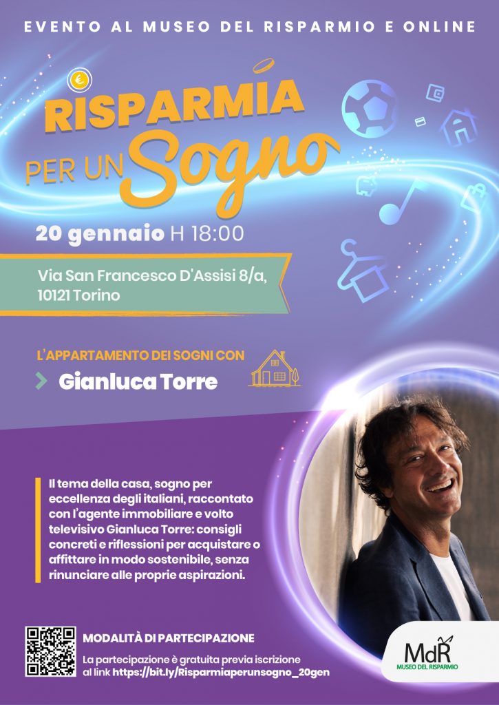 Martedì 20 gennaio alle ore 18 si terrà “L’appartamento dei sogni con Gianluca Torre”, terzo appuntamento de RISPARMIA PER UN SOGNO, una rassegna di incontri per scoprire come una gestione consapevole del denaro aiuti a vivere meglio e a guardare al futuro con serenità.