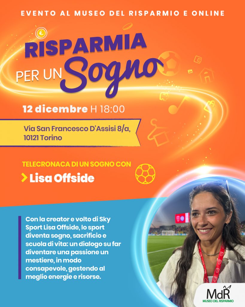 Venerdì 12 dicembre alle ore 18 si terrà “Telecronaca di un sogno con Lisa Offside”, terzo appuntamento de RISPARMIA PER UN SOGNO, una rassegna di incontri per scoprire come una gestione consapevole del denaro aiuti a vivere meglio e a guardare al futuro con serenità.