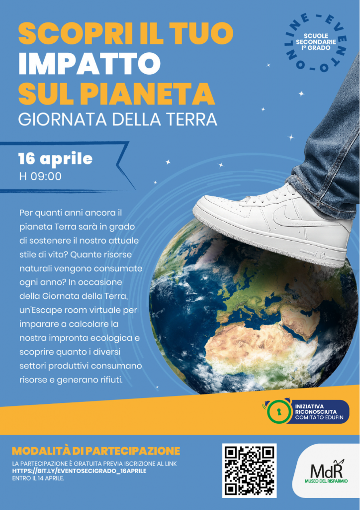 In prossimità della Giornata della Terra, giovedì 16 aprile alle ore 9 il Museo del Risparmio dedica alle scuole secondarie di primo grado l’evento “Scopri il tuo impatto sul pianeta”, per scoprire l’impronta ecologica e l’impatto delle attività produttive su risorse e rifiuti.