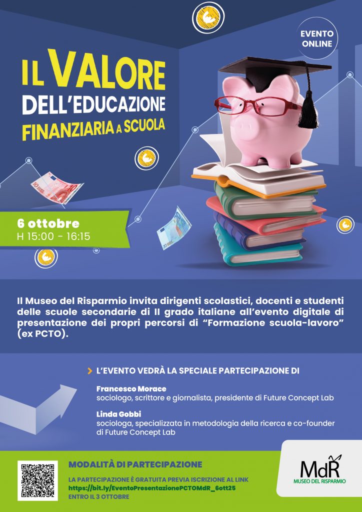 On Monday, 6 October, at 3:00 PM, the Museum of Saving is pleased to invite principals, teachers, and students of Italian high schools to the digital event presenting its “School-Work Training” (ex PCTO) programs.