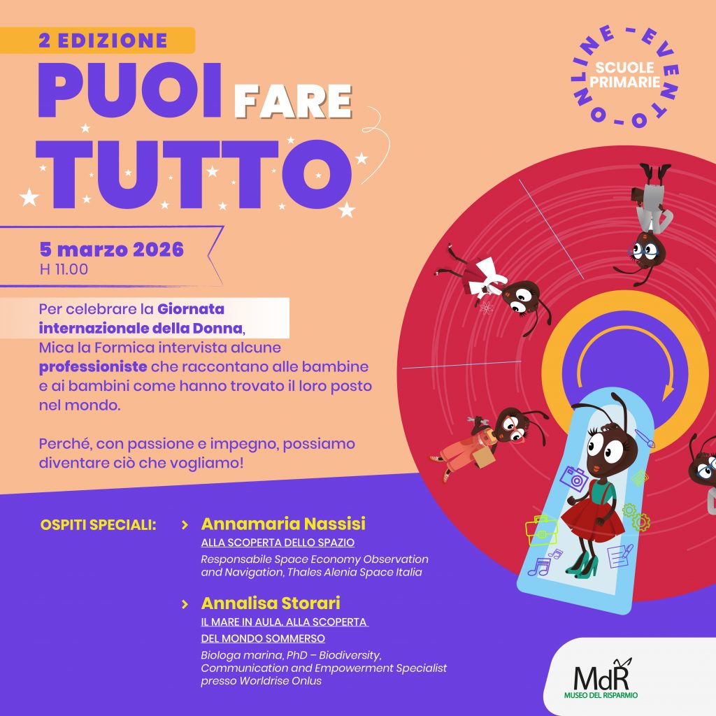 On the occasion of International Women’s Day, on Thursday, March 5 at 11:00 am, the Museum of Saving is dedicating a special event to primary schools entitled YOU CAN DO ANYTHING, to discover that with enthusiasm and commitment every dream can become reality.